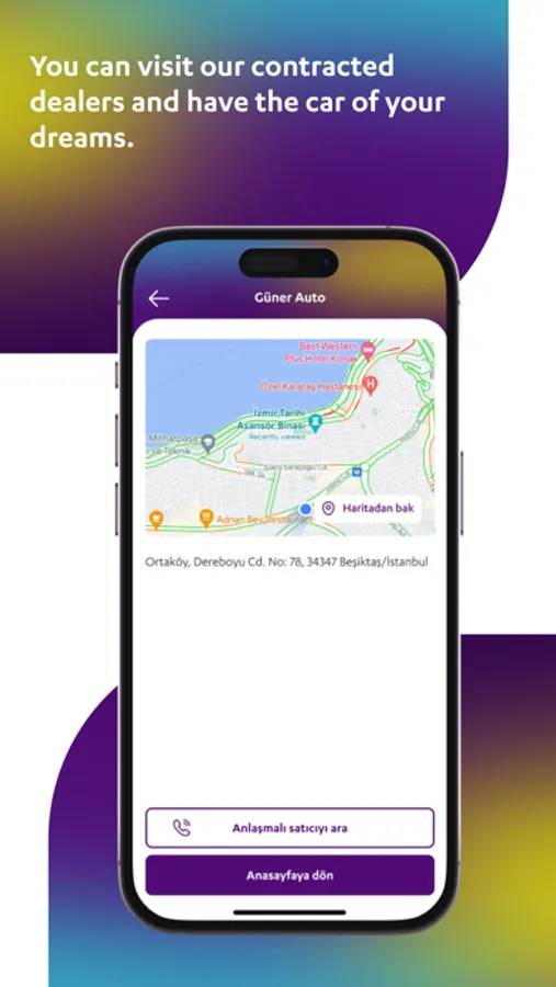 - Anlaşmalı satıcılarımızın lokasyon ve adres bilgisine ulaşabilir, kredi onayı aldıktan sonra dilediğin satıcımızı ziyaret ederek hayalindeki araca sahip olabilirsin.