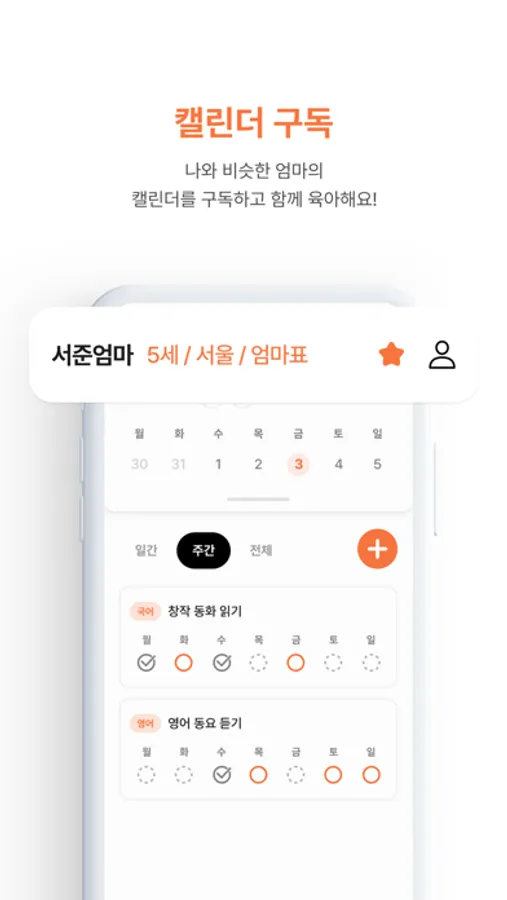 우리 아이의 일/주간 계획부터 체험/전집/교구까지 관리하고, 나와 비슷한 다른 엄마의 캘린더를 구독해 함께 육아해요!
