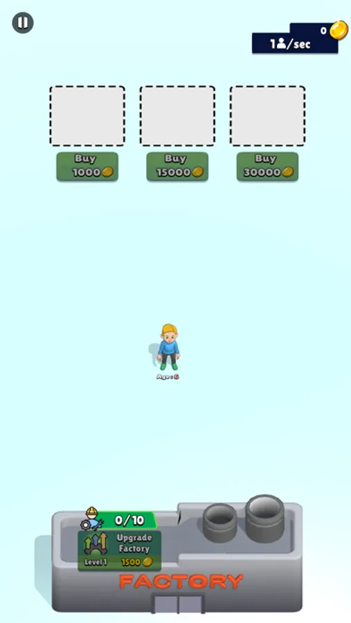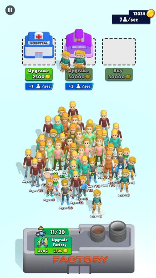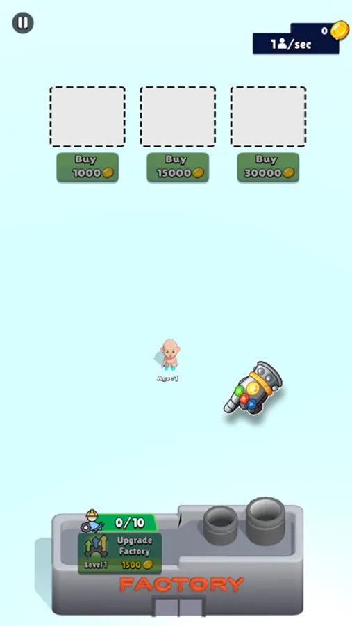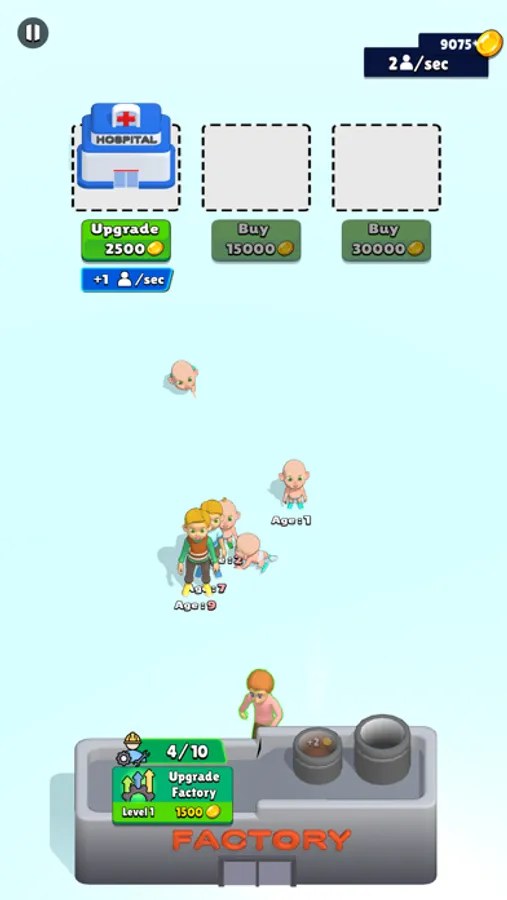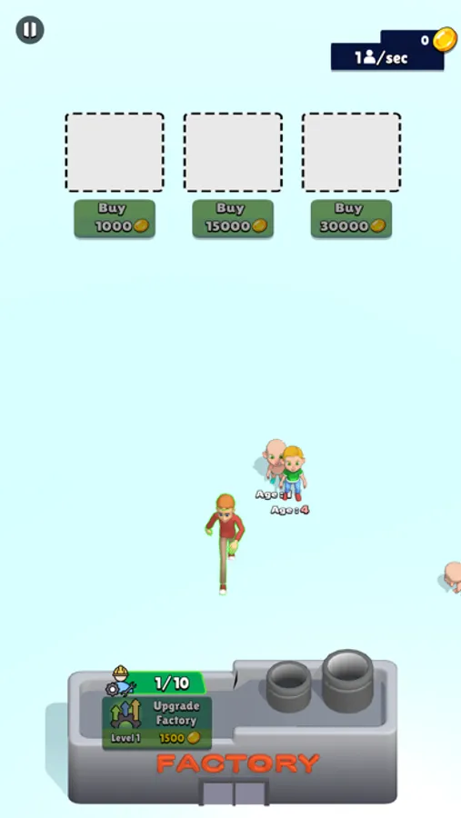 Grow people fast by clicking on the screen, send adult people to the factory, earn money, buy structures that will give extra people and earn more money!