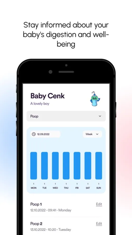 * Easy-to-use diaper changing tracker for monitoring your baby's digestive health