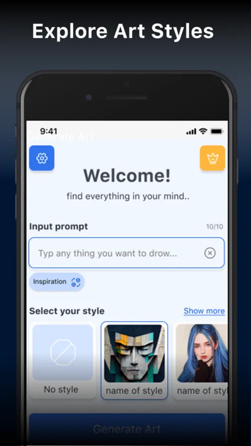 Start by clicking the "Generate" button in the main menu, then choose a creation method from there or select inspiration prompt to create amazing your own artwork