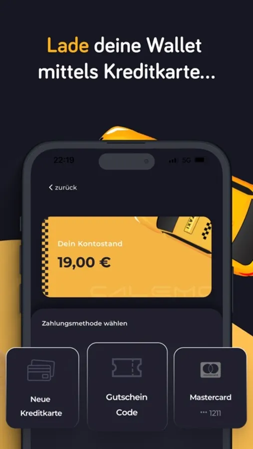 Mit Calemo hast du deine persönliche Wallet zur bargeldlosen Bezahlung von Taxi-Fahrten. Zahle einfach über deine Kreditkarte oder löse Gutscheine von Gemeinden, Unternehmen oder Veranstaltern ein.