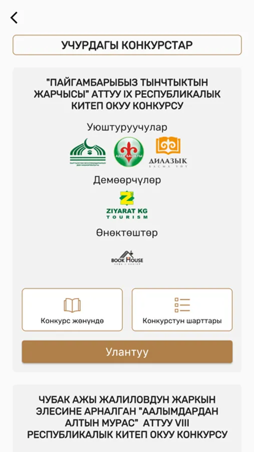 This app is an online testing app. The purpose of this app is to encourage people to read more books. This app is designed to allow people to test themselves based on specific books’ content. We add questions about several books regularly. There is no specific target audience, everyone can benefit from this app to test himself/ herself. App is in 2 languages, Russian and Kyrgyz.