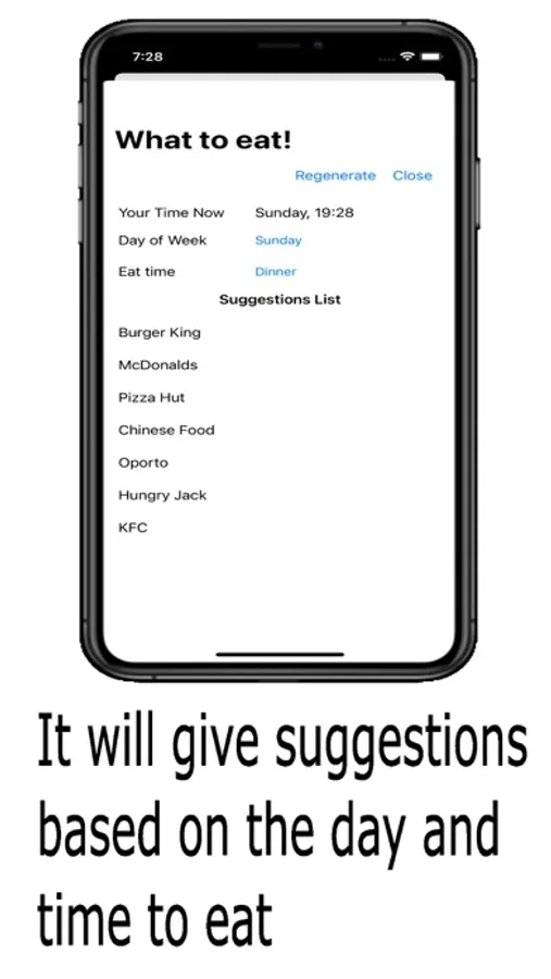 "EatSuggester" is an app that solve your daily food choice. When you are thinking what to eat on a day, this app can help you by suggesting food that you inserted into the list. Just press the "What to eat!" button to generate the food list to be picked and consumed on the day. The list is generated fresh everytime. You will be suprised with the result. As example: you can insert your favorite restaurants and its opening time.