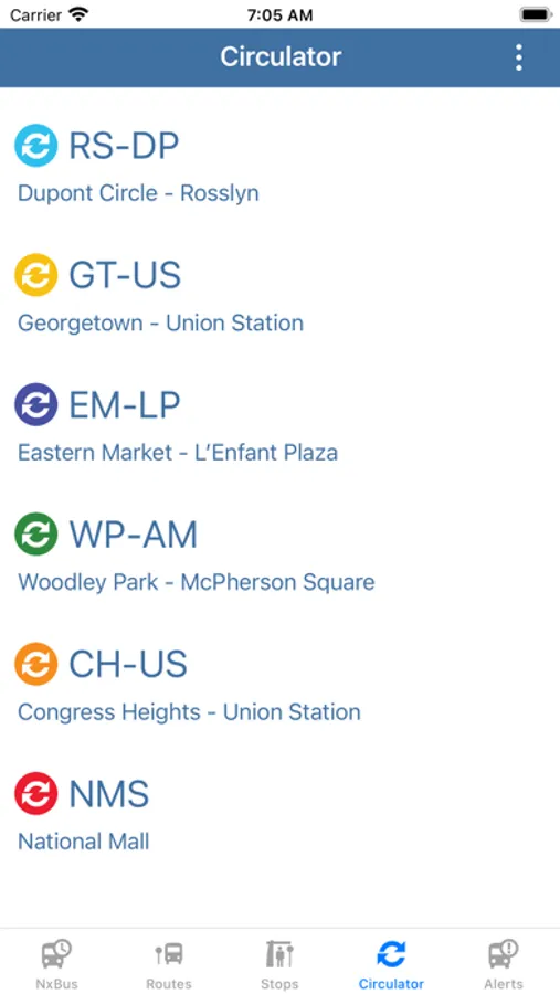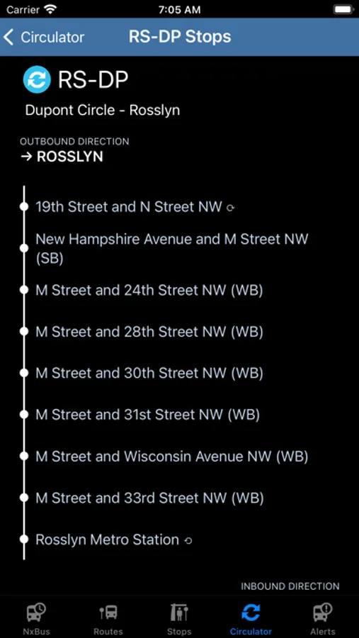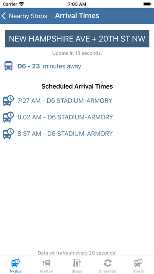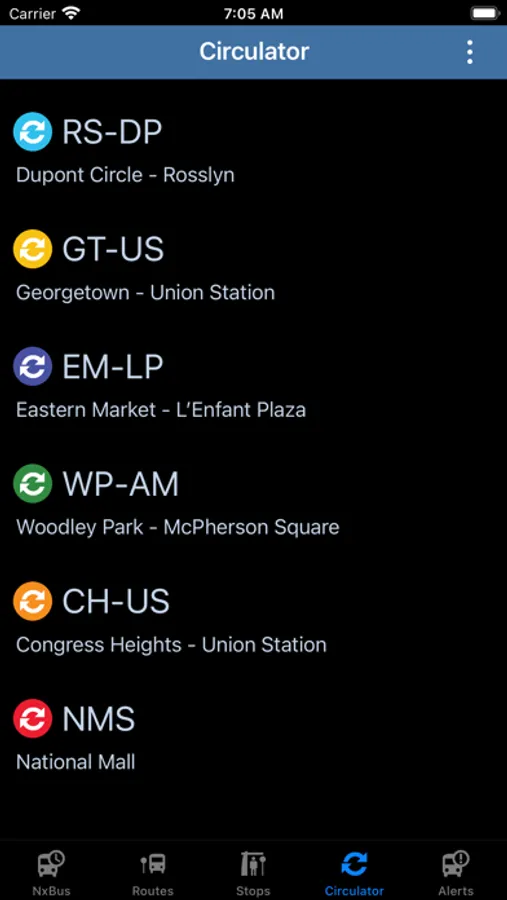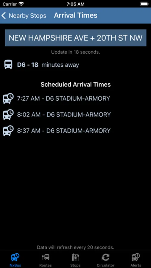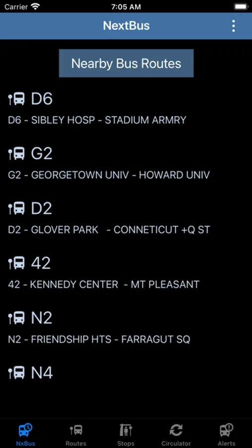 DC NxBus will show predicted MetroBus and DC Circulator arrival times for the nearest bus stop, bus route, or bus stop / bus route you choose.
