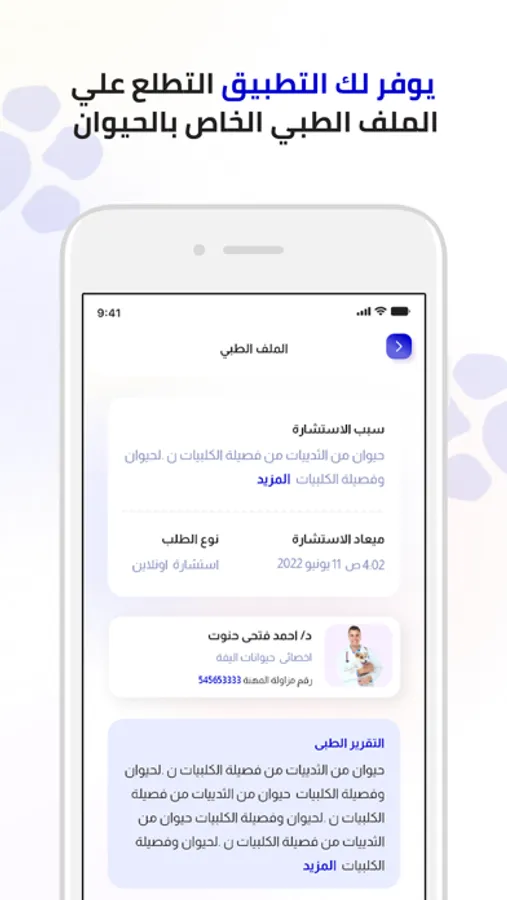 تطبيق حيواني دكتور هو تطبيق مخصص للاطباء البيطرين و يمكن من خلال التطبيق تحديد المواعيد الخاصة بالطبيب و استقبال الاستشارات الخاصة بالعملاء و الرد عليها
