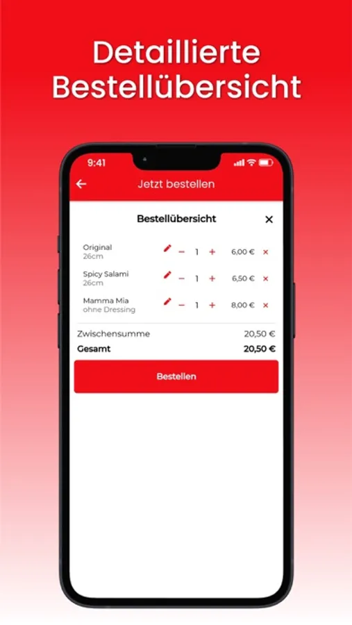 Super leicht online essen bestellen mit unserer App. Einfach auf den JETZT BESTELLEN Button klicken und los geht's. Du hast eine rießige Auswahl von leckeren Pizzen, Burgern, Salate und vieles mehr. Deine Bestellung wird frisch für dich zubereitet.