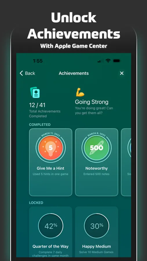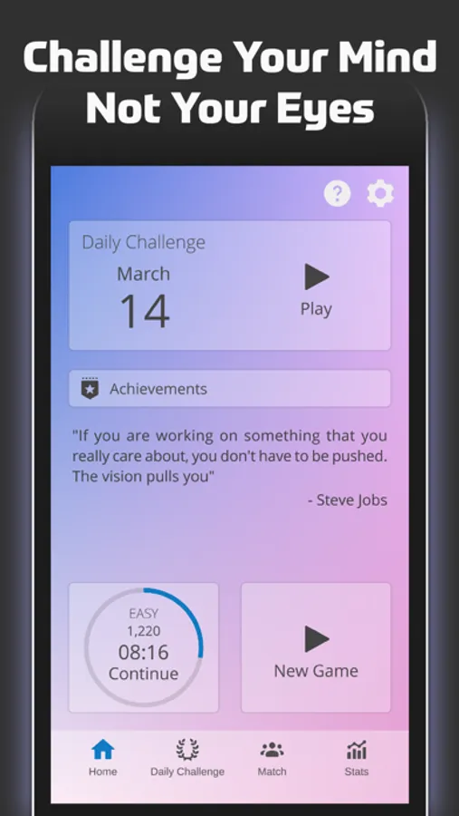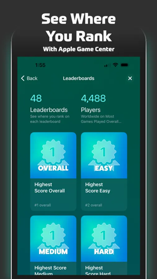 We developed new insightful visuals to view your progress and improvement statistics by viewing your own historical game progress, as well as comparing your achievements and stats with worldwide players on leaderboards through Apple Game Center. Play across multiple devices with cloud save.