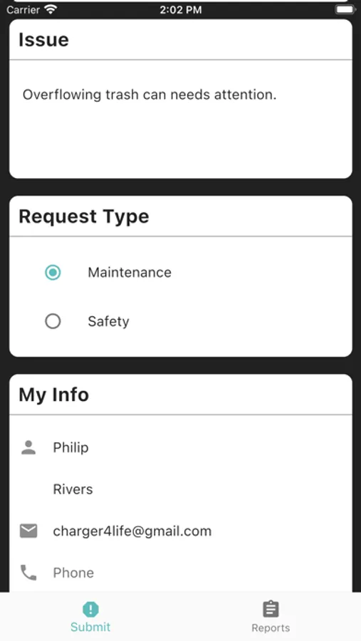 Through this app, you can describe a concern, the location of an incident, and include photos of a service request.