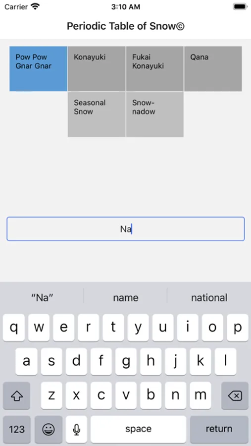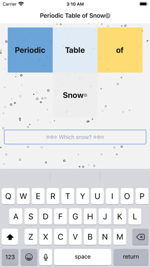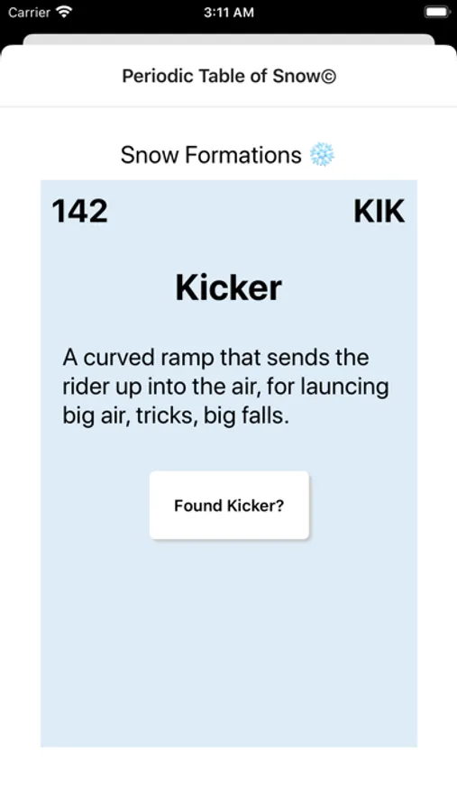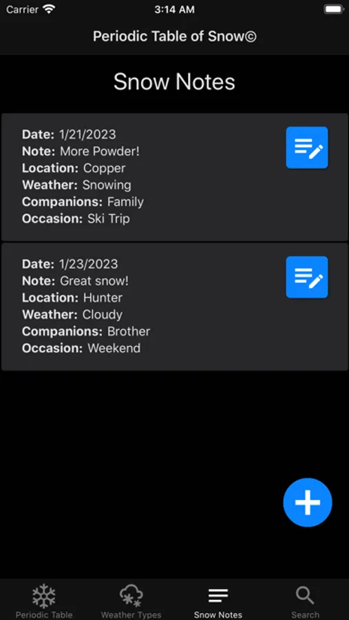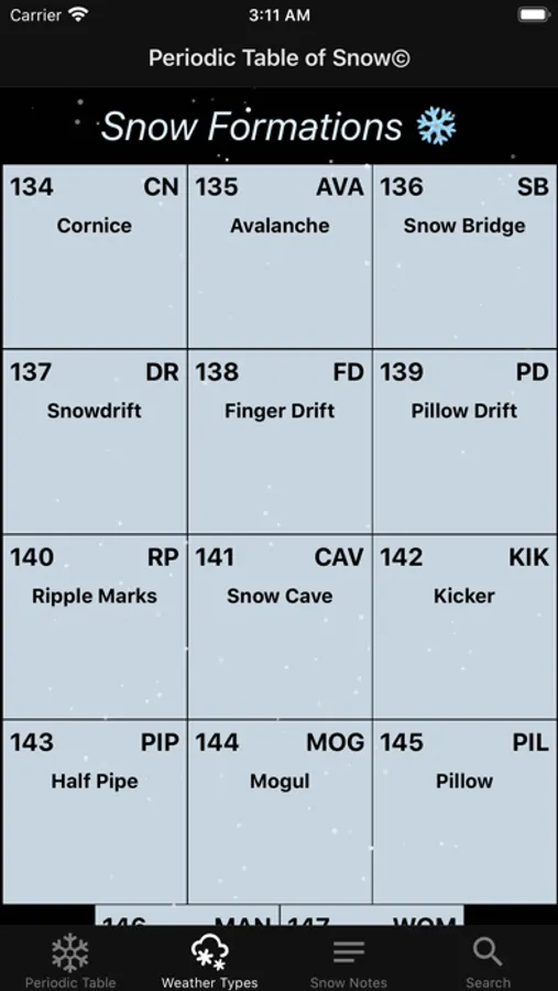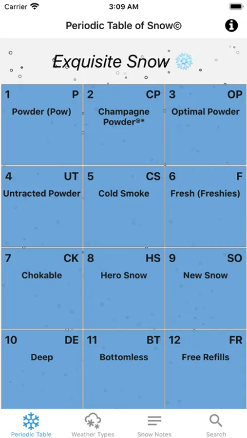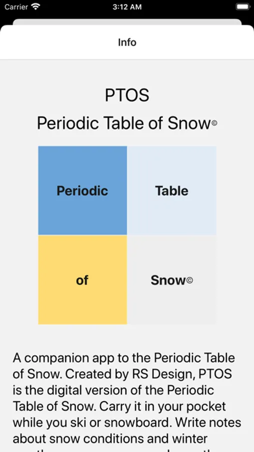 A companion app to the Periodic Table of Snow. Created by RS Design, Table of Snow is the digital app version of the Periodic Table of Snow. Carry it in your pocket while you ski, snowboard, snowshoe or any outdoor winter activity. Keep track of snow conditions, winter weather, and more with the snow notes feature. Find and mark the proper name of snow conditions that you encounter in the wild. Learn the types of snow, scientific classifications, and descriptions. And don't forget the snow humor! It's all packed into the Table of Snow app.
