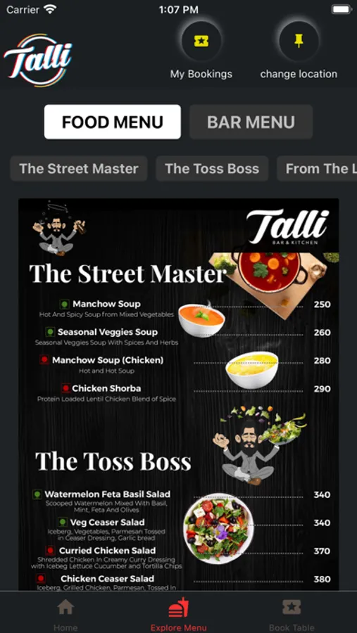 Book your table for a special occasion Also, Talli- Bar & kitchen will show you a list of all drinks and food items you can enjoy and offer to your friends.