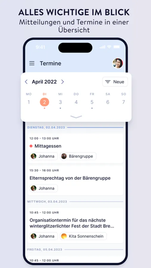 Sommerfest, Waldausflug oder geplante Schließtage. Im Kalender findest Du die für Dich als Elternteil wichtigen Termine und Veranstaltungen aus Deiner Einrichtung. Diese kannst Du Dir jederzeit in einer übersichtlichen Wochen-, Monats- oder Listenansicht anzeigen lassen.