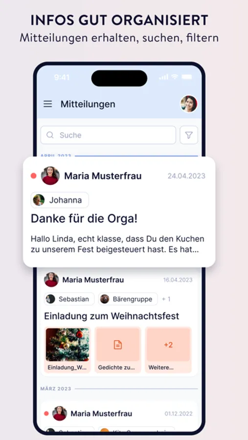 Neuigkeiten, Mitteilungen oder Termine – alle Kitainfos zu Deinem Kind sind unter Berücksichtigung höchster Sicherheitsstandards in der App gespeichert.