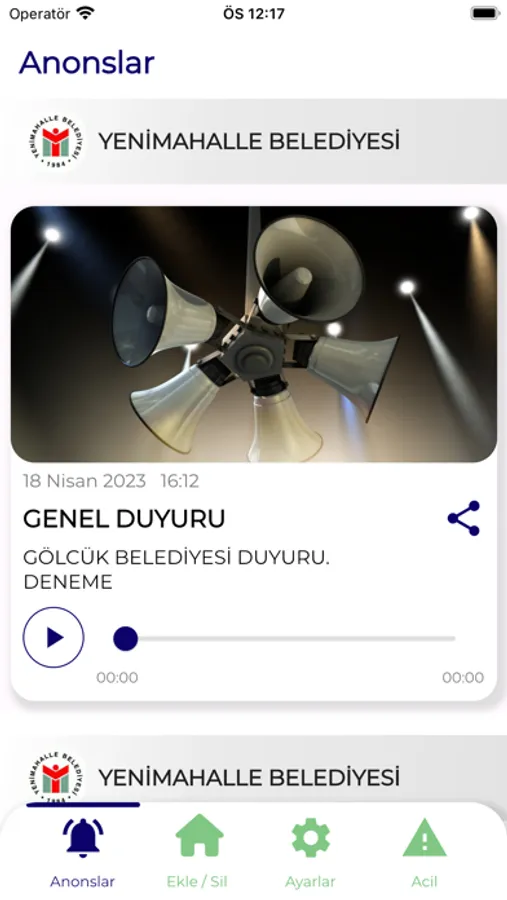 Belediye seçimi menüsünde, belediye listesi içerisinden ilanlarını takip etmek istediğiniz belediye veya belediyeleri seçebilirsiniz. Bu belediyelere ait bir ilan paylaşıldığında ilanlar menüsü içerisindeki akışta bu ilan görüntülenir. Eğer sesli bir ilansa oynatma tuşuna basarak ilanı dinleyebilirsiniz. İlana ait görseli görüntüleyebilir ve paylaş seçeneğini kullanarak ilan metnini diğer kişilerle paylaşalabilirsiniz.
