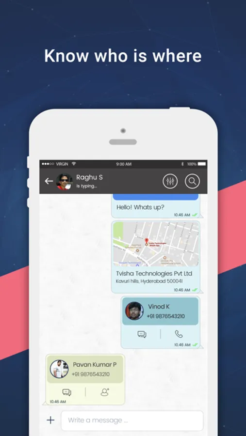 Location and contact sharing- Allows to share your current location with team and boss with team chat app and directly make a call to shared contacts to catch up with your colleagues