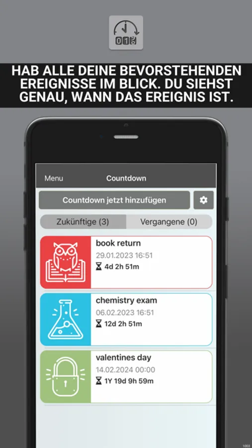 You can create multiple countdowns and be reminded when the appointment is due. You can freely choose the name for the countdown and also customize the icon and the color.