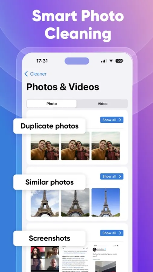 Introducing Cleaner, the ultimate app for decluttering and optimizing your phone's performance. Say goodbye to duplicated photos and videos taking up valuable storage space. Our advanced detection technology scans your phone and identifies any duplicates, giving you the option to delete them with just a few taps. Not only will this free up storage, but it'll also make your phone run faster and smoother.