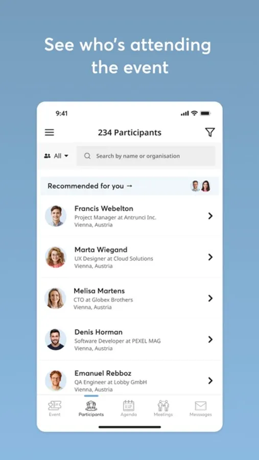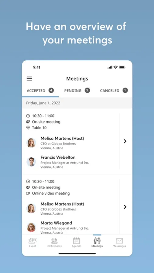 The startup days App enables you to directly book 1:1 meetings with other participants to meet them face-to-face at the event day. Furthermore, the App provides you with your personal agenda, including all your meetings, sessions, and workshops. On the App you will find all the vital information needed for a seamless event experience at startup days.