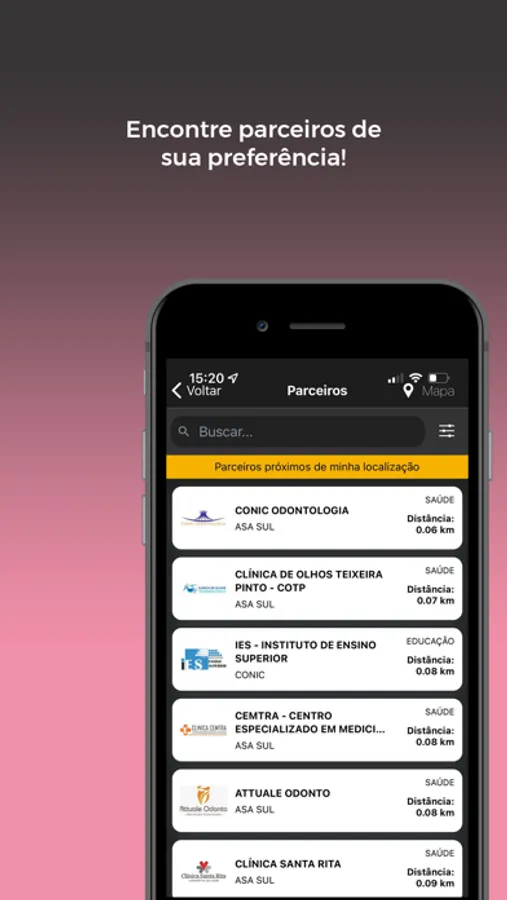 Busca de parceiros através do geolocalizador, filtragem personalizada para as buscas de empresas parceiras, acesso ao cartão virtual para utilizar os descontos, acesso a notícias e além do SAC para atendimento.