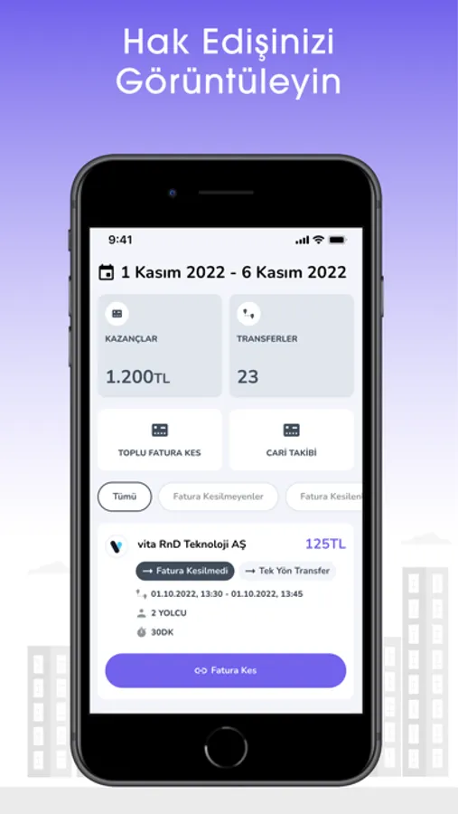 Seçtiğiniz tarih aralığındaki işlerinizi, aldığınız ve alacağınız toplam tutarları görüntüleyebilir, faturalarınızı kolayca kesebilir ve ilgili kişi ve kurumlar ile paylaşabilirsiniz.