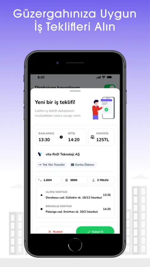 Faaliyet alanınız dahilindeki kurumsal veya münferit iş tekliflerinizi tek bir platform üzerinden alabilir, günlük çalışma planınızı görüntüleyip boş saatlerinizi taşımacılık firmaları, tur ve turizm firmaları, acenteler, hastaneler, sağlık merkezleri, oteller vb. ile paylaşabilirsiniz.