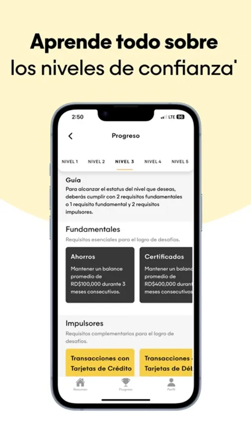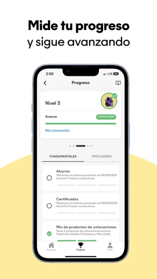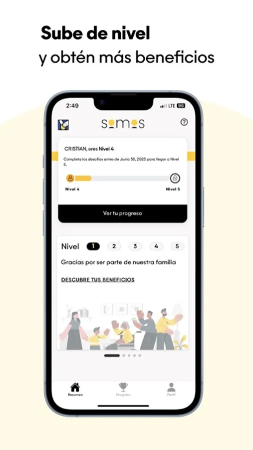 La aplicación te informa sobre tu relación con APAP a través de niveles, que podrás alcanzar y mantener al cumplir con los objetivos definidos para cada uno.