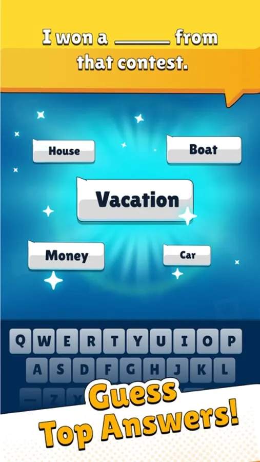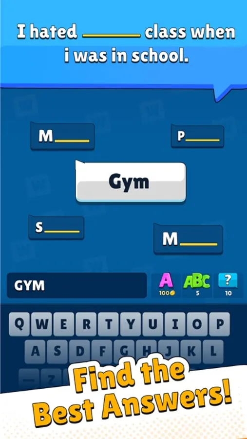 Popular Words is inspired by the TV shows such as America Says, Family Feud and Jeopardy. You have to guess what most of the people say to certain questions? Each level presents a fill in the blank question and five possible answers. There would be several correct answers, but you have to find the most common 5 of them whose first letters are shown to give players a hint. Blank length indicates the length of the correct word.