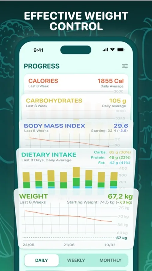 In our application, you will receive a nutrition program created specifically for you, you can track your progress, keep your food diary, and share your progress.