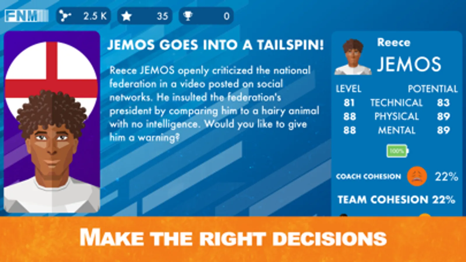 A player who lets loose on social networks, a delay in training, an argument between players, anything can happen. It's up to you to know how to react to keep your group in the best conditions.