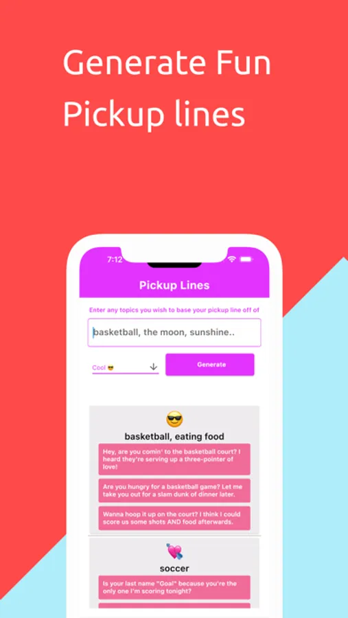 Whether you are on Tinder, Bumble, Hinge or just messaging someone through text, use the power of AI to help come up with the best replies and pickup lines to land your crush!