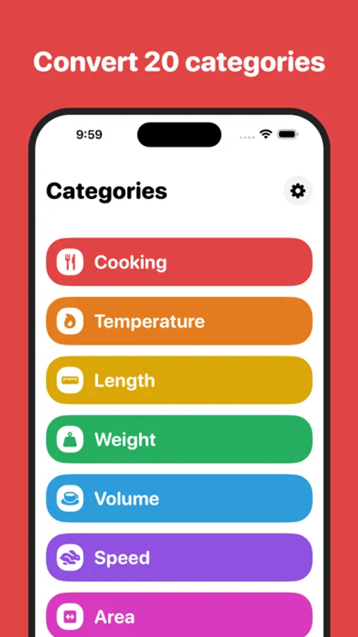 Convert between: cooking, length, weight, temperature, area, volume, speed, time, energy and pressure.