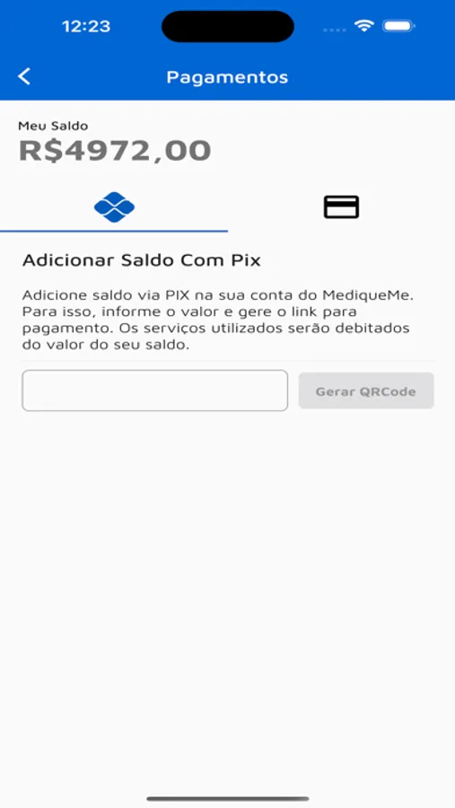 Através do MediqueMe você realiza a compra dos serviços e paga somente na hora do atendimento. No APP é possível cadastrar cartões de crédito, que oferecem opções de parcelamento, ou inserir um saldo via PIX, do qual será debitado o valor dos serviços utilizados.