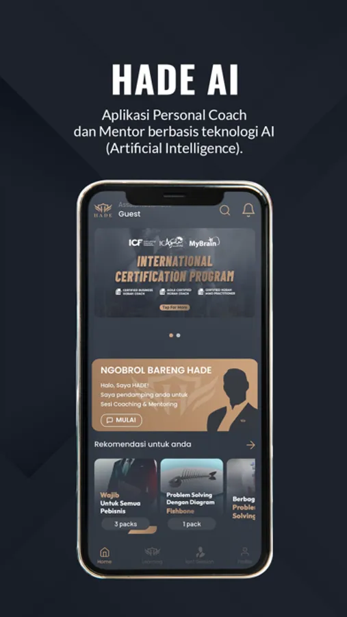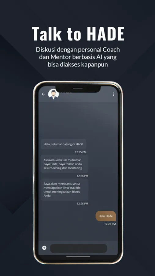 HADE AI adalah aplikasi digital yang diciptakan khusus untuk membantu para pemilik bisnis UMKM dan para leader untuk mendapatkan solusi dari tantangan bisnis yang mereka hadapi lewat metode coaching dan mentoring. Selain para user dapat menikmati pendampingan dari para profesional coach dan mentor, aplikasi ini juga menyediakan solusi pendampingan dan pusat informasi berbasis AI.