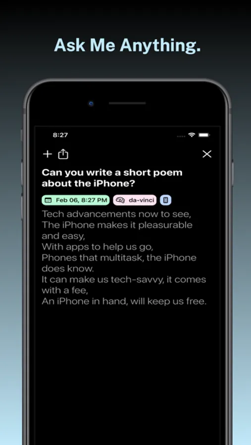 Press, hold, and ask anything your heart desires - receive instant, thoughtful, and shockingly creative answers from groundbreaking artificial intelligence models. Even ask your new companion to draw completely original art - simply describe what you want to create!