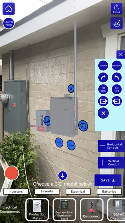 Show homeowners what your solar installation will look like, using Augmented Reality. You can detect the wall and put inverters, batteries, conduit, disconnects, and more!