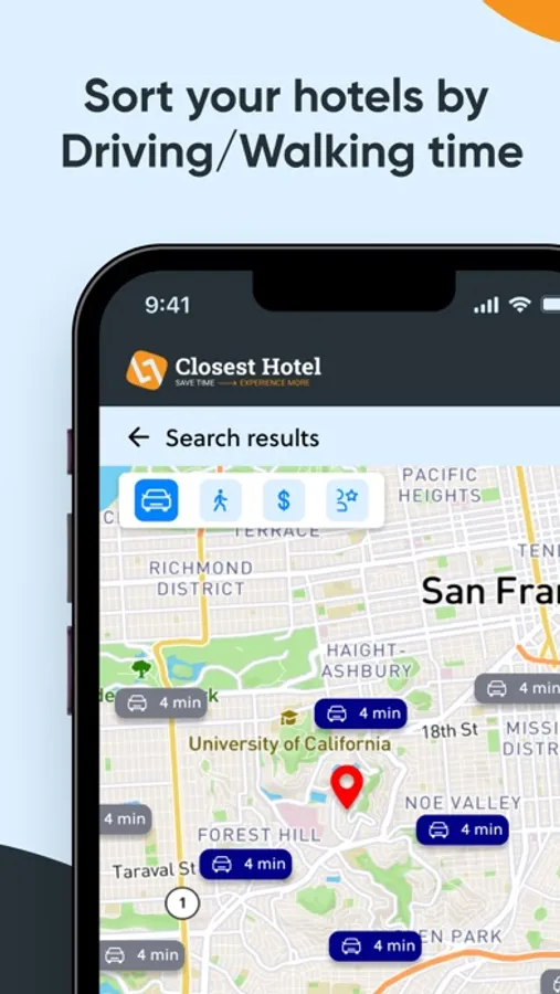 With ClosestHotel, you're in complete control. Just type in your desired address and voilà! If you want to fine-tune the location, drag the pointer on the map and find the updated driving/walking times to your hotel. Discover a curated list of hotels sorted by actual travel time from your event venue. Whether you prefer a leisurely stroll or a quick drive, we've got you covered. No more guessing games - find the perfect hotel that suits your schedule and preferences.
