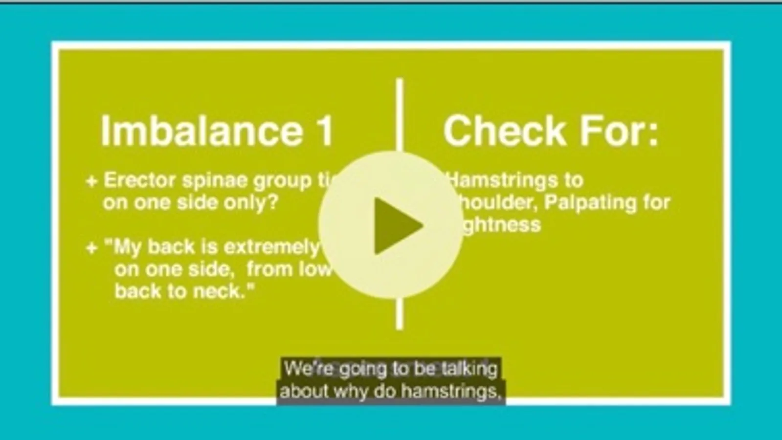 This evidence-based hour long video is a teaching guide for mentoring massage therapists. The video is beautifully crafted and easy to follow along. It will teach you how to effectively assess, identify, and treat the underlying causes of strained hips, low back, hamstrings and more.