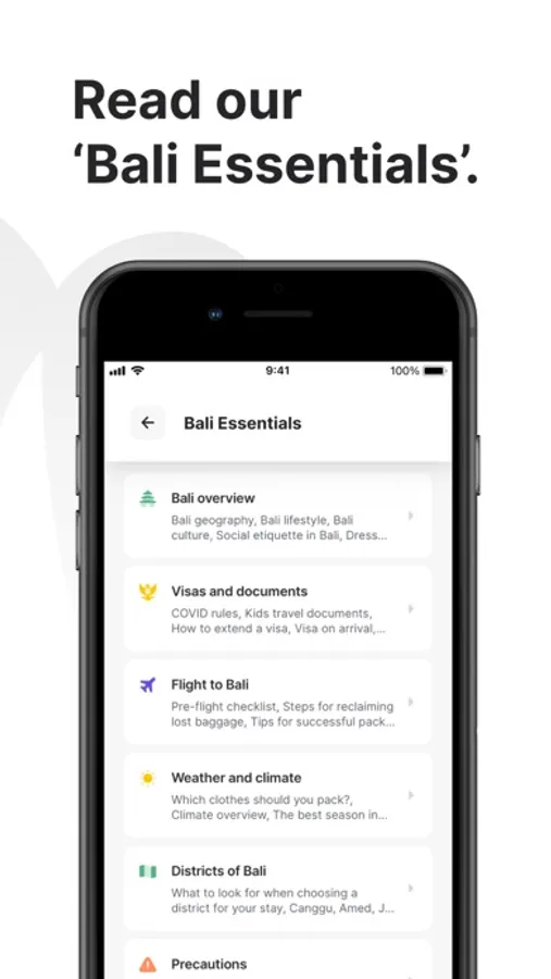 The Bali Essentials section of the app is a comprehensive guide to everything you need to know before and during your trip, including visa and document requirements, weather and climate, transportation options, and healthcare. You can also find information on events and tours, places for rent or sale, and transport rental services provided by our partners.
