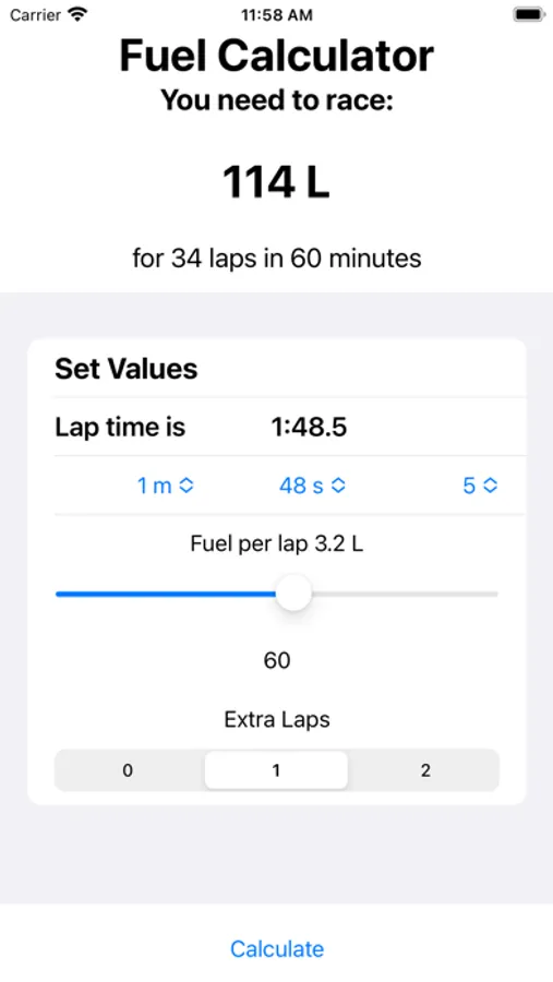 With this app you can calculate, how much fuel you need to race. Set values such a lap time, fuel per lap, race length and see how much fuel is needed to finish. Don`t forget set extra laps if you have a formation lap and very long race.