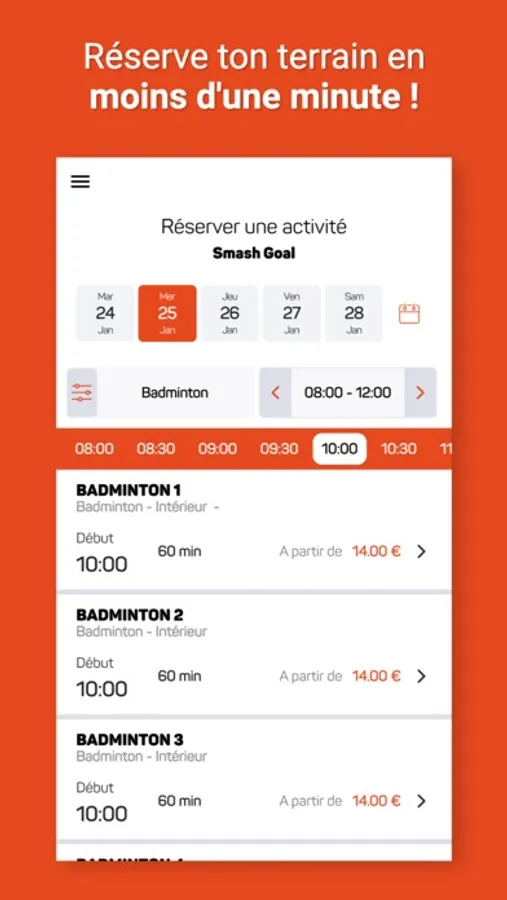 Fini la corvée de réservation ! Avec l'application tu n'as plus qu'à accéder aux créneaux disponibles et à en choisir un. Le club recevra alors automatiquement ta réservation.