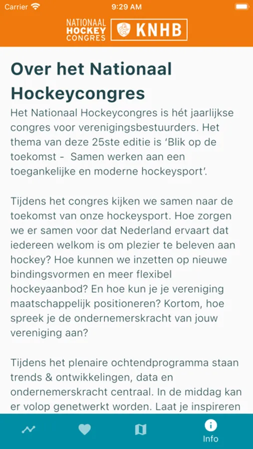 Op zaterdag 11 februari 2023 organiseert de KNHB de 25ste editie van het Nationaal Hockeycongres. Het thema van het congres is ‘Blik op de toekomst – Samen werken aan een toegankelijke en moderne hockeysport’. We hebben een mooi programma voor je samengesteld waarin veel ruimte is om te netwerken. In deze app vind je het programma van het Nationaal Hockeycongres.