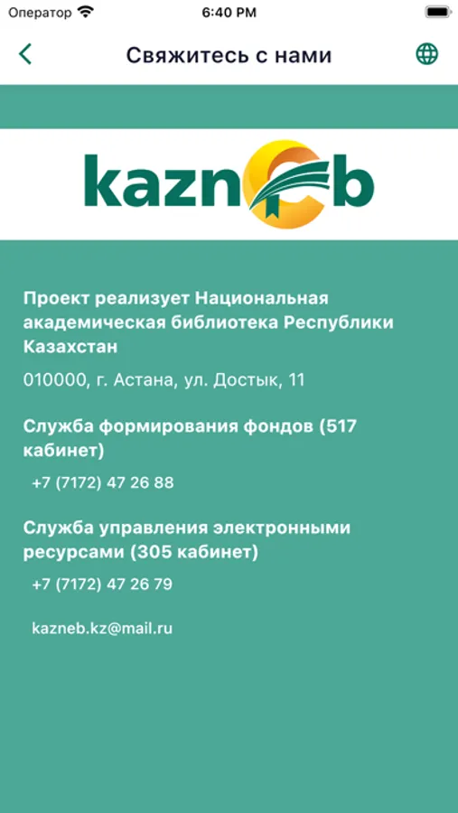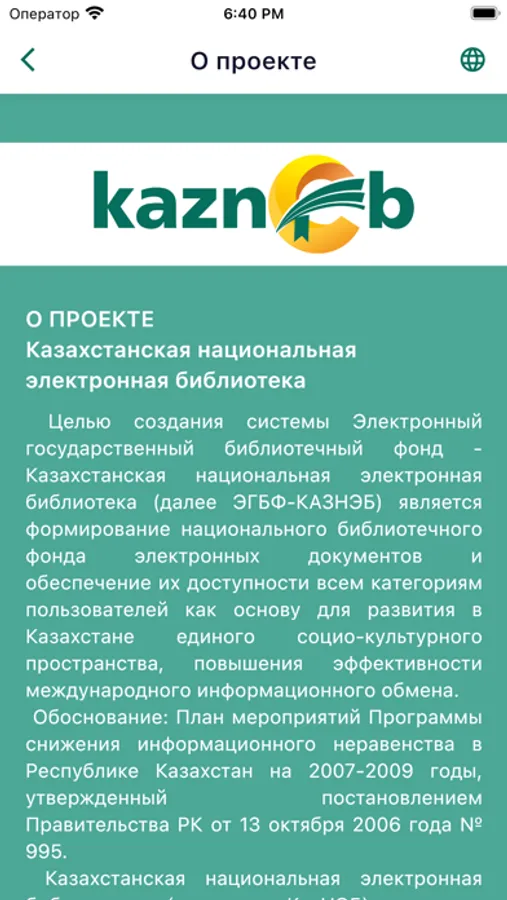 Мобильное приложение КазНЭБ представляет собой свободный доступ к каталогу электронного государственного библиотечного фонда и Единое электронное хранилище копий книг с депозитарным и пользовательским фондом осуществляющее обеспечение доступа к национальному культурному и научному наследию посредством информационно-коммуникационных технологий.