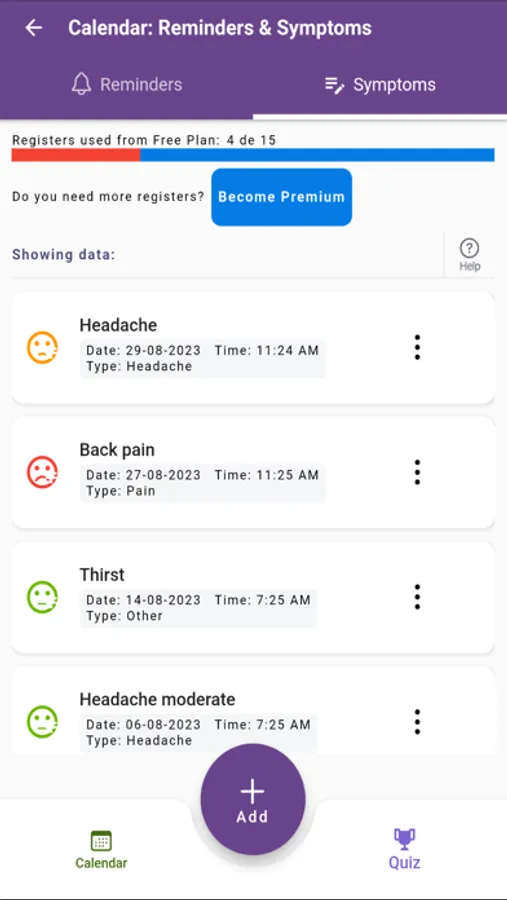 -Calendar and Reminders: In this section you can enter your usual medication and generate reminders taking into account their administration hours; you will have the possibility to determine the dose, the frequency and make comments that may be useful. Another high-value feature in this section is the symptom calendar. In this section, you can record a symptom that you consider and specify its frequency, intensity, and write a note that can help interpret the record. The sequence of records will be reflected in the calendar.