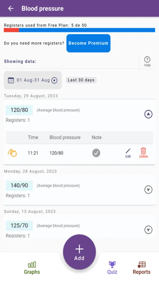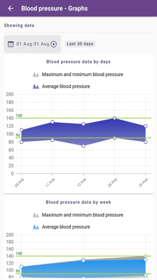 -Blood pressure: In this section, the blood pressure values will be recorded and displayed in simple graphs for interpretation by your referring physician. The values will be exported in PDF format, providing the average daily and weekly pressures, which can be of great help in determining the need for treatment or further follow-up by your doctor.