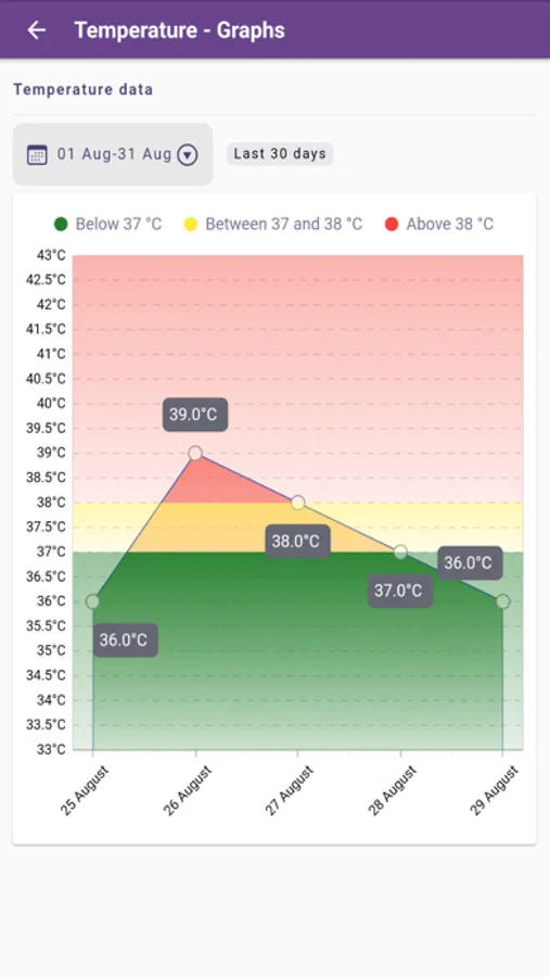 -Temperature: With this functionality you can record your daily temperature values. They will be displayed in simple graphs and the data can be exported in PDF. An adequate monitoring of the temperature can be of great help to see the evolution of infectious and inflammatory processes, among others; as well as to control the basal temperature of our body and its fluctuations during the month.