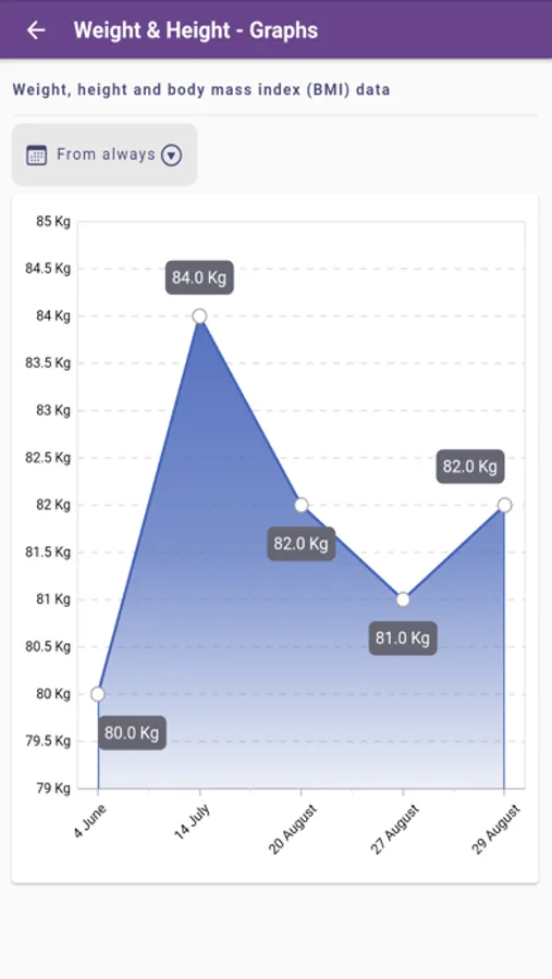 -Weight, height and BMI: In this section the values of weight, height and Body Mass Index will be recorded. The values will be shown in simple graphs and will be exported in PDF for better interpretation.