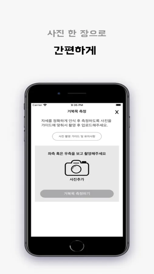 - 자세를 정확하게 분석하기 위해 좌측 혹은 우측을 보고 촬영해주세요.