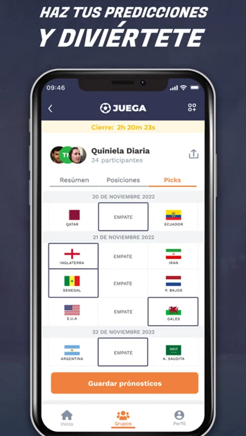 Juega allows you to compete with your friends and other fans predicting professional soccer matches outcomes. Prove your knowledge of the sport, create, share with your friends and manage prediction games and quinielas.