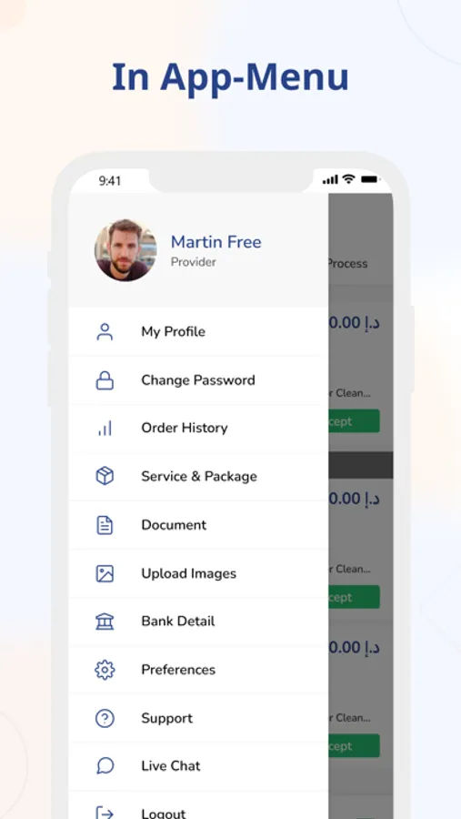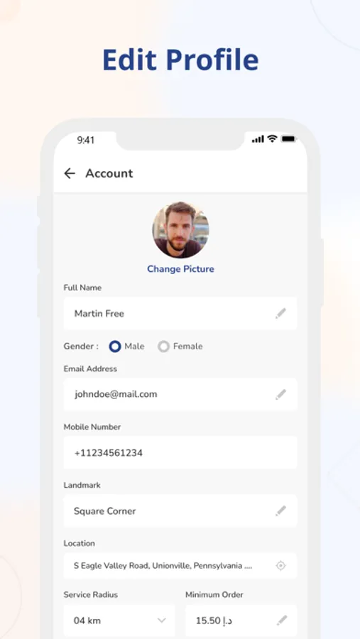 -Manage profile details such as name, email, contact, profile picture, service radius, etc