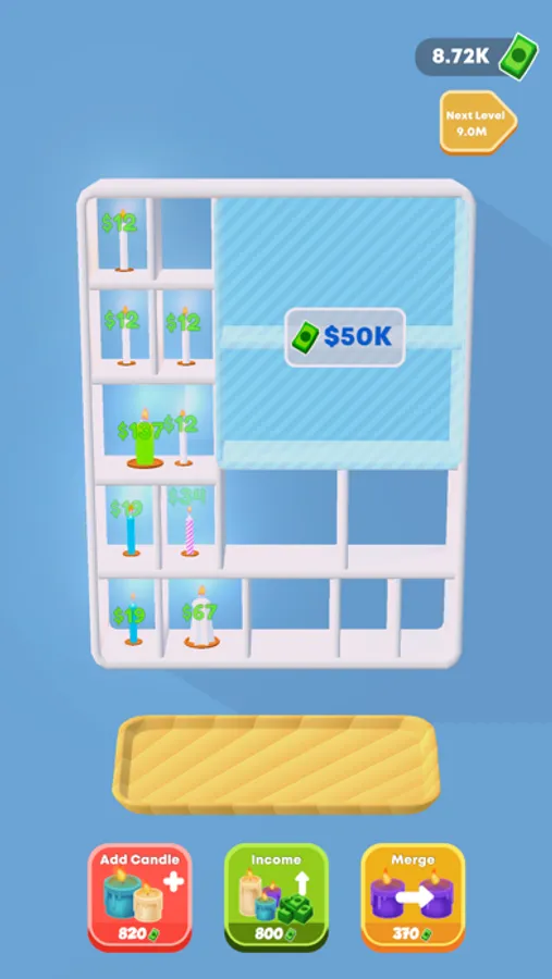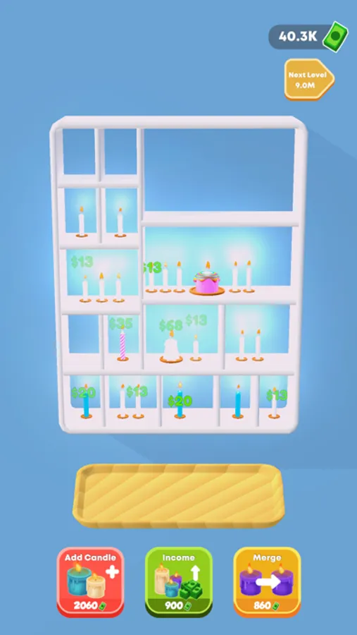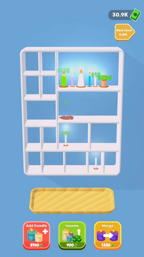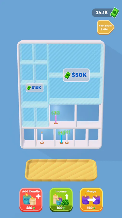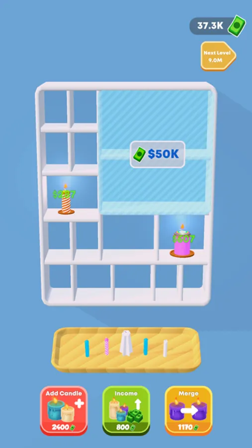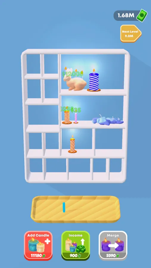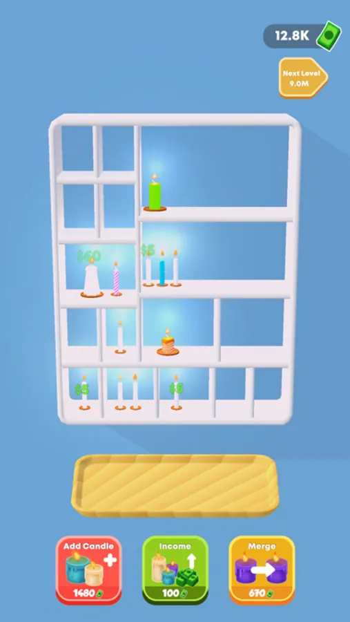 Place your candles! Place each candle on the shelf and it will start burning. Earn money as the candles burn down.